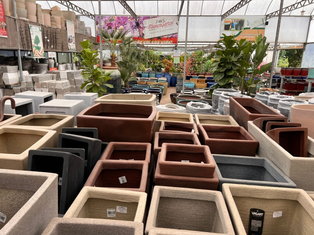 para jardinagem e paisagismo, em especial vasos e cachepots, colocamos a sua disposição as mais recentes novidades e tendências do mercado. Você dispõe também de inúmeros acessórios para cuidar de sua área verde, bem como ambientá-la e decorá-la com fontes, móveis, pedras, entre outras opções de artigos de decoração do lar. Mantemos fornecimento semanal de produtos de todas as categorias, inclusive da Cooperativa Veiling Holambra e Ceasas de outros estados. É a garantia de produto novo, fresco e ainda “orvalhado” a disposição para o cliente.